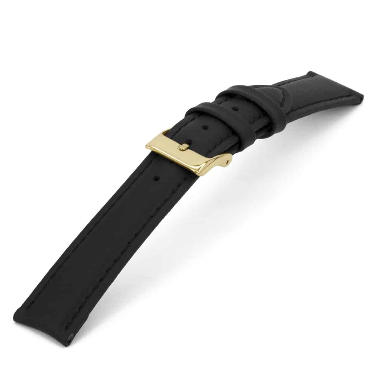 Zwart lederen horlogeband licht gevuld met goudkleurig edelstaal gesp.