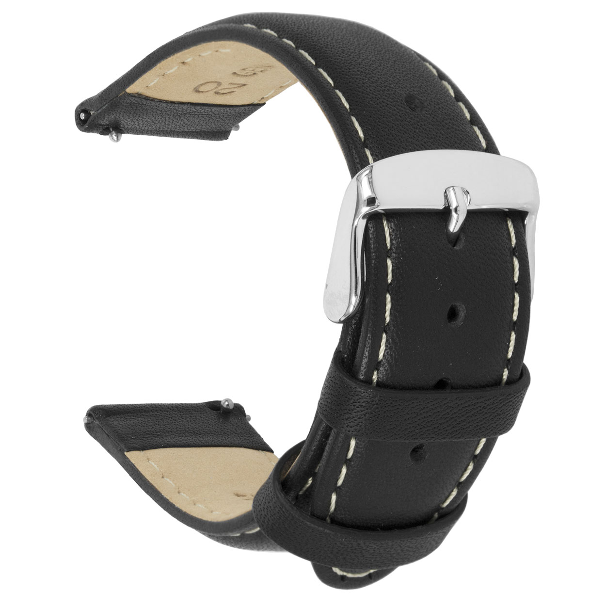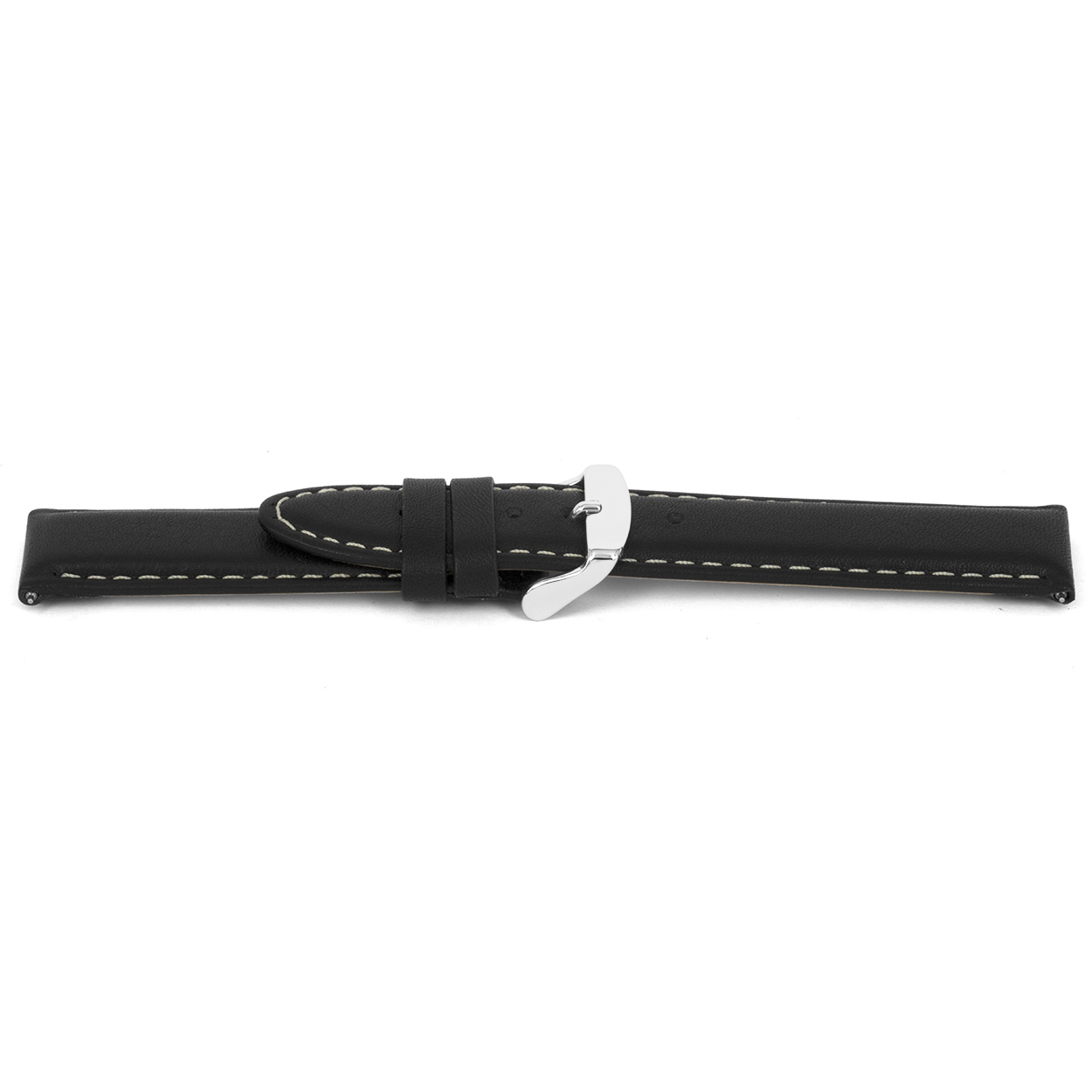 Kalfslederen horlogeband, oily zwart en beige gestikt.